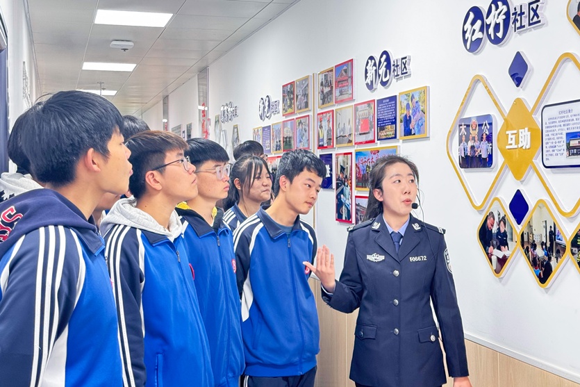到達濱河派出所警示教育基地,大家隨著解說民警的引導(dǎo),依次參觀了接報案大廳、智能警用裝備柜、文化長廊、綜合指揮室、“暖心警務(wù)會客廳”、“反詐一角”等場所。同學(xué)們邊聆聽講解,邊讀圖品句,邊觀看視頻,感受了真實的警營生活。在青少年法制教育基地,解說民警為參研學(xué)生上了一堂題為“法不向不法讓步,與法同行護航青春”的法治課。民警運用通俗易懂的語言以案釋法、以案說法,進一步增強了同學(xué)們的法治觀念和自我保護意識。最后一站來到辦案區(qū),民警認真向同學(xué)們介紹了人身安全檢查室、辨認室、詢問室、訊問室、候問室等案件辦理專用區(qū)域的設(shè)備實施及用途。