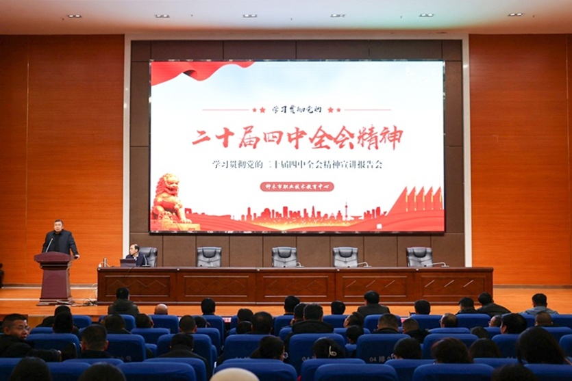 為深入學(xué)習(xí)貫徹黨的二十屆四中全會(huì)精神,1月8日,神木市職業(yè)技術(shù)教育中心特邀中共陜西省委黨校(陜西行政學(xué)院)中共黨史教研部主任苗光新教授作了《黨的二十屆四中全會(huì)精神解讀》專題講座。校黨總支書記張強(qiáng)主持,全體校委會(huì)成員,濱河、鏵山校區(qū)全體班主任、中共黨員、教研組長(zhǎng)、技能帶頭人等聆聽(tīng)了講座。